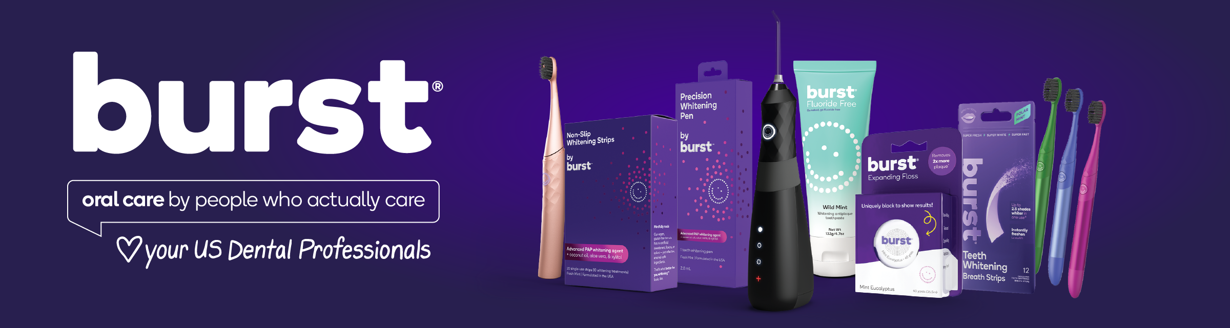 Elevate your oral care routine with BURST, where cutting-edge technology meets sleek design for a healthier, brighter smile. This collection features dentist-approved, high-performance oral care essentials, from the powerful sonic toothbrushes to charcoal-infused floss, water flossers, and whitening treatments.