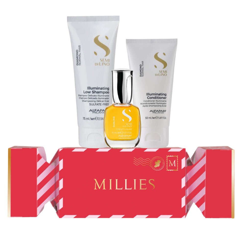 Unwrap the ultimate hair-care treat this festive season with the Alfaparf Semi Di Lino Diamond Illuminating Gift Set exclusively packaged as the Millies Exclusive Alfaparf Illuminating Christmas Cracker.