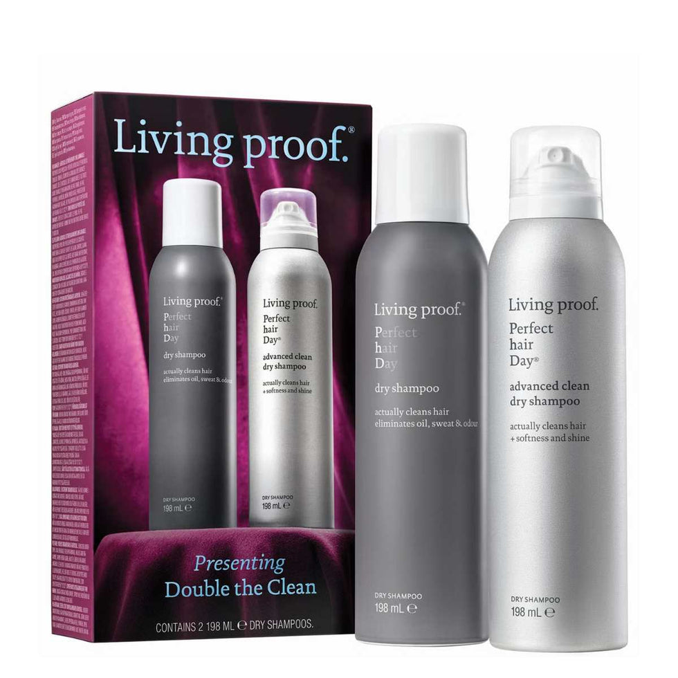 Living Proof Double the Clean Perfect Hair Day Dry Shampoo Gift Set is a no-rinse dry shampoo duo that refreshes hair between washes by absorbing oil, sweat, and odor while leaving hair and scalp feeling fresh, clean, and soft.