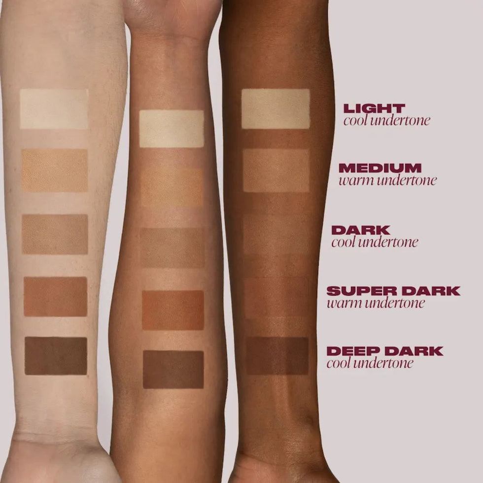 SUPER DARK: Aqua, Hydrogenated Polydecene, Butane, Hydrogenated Polyisobutene, Isobutane, Propane, Disteardimonium Hectorite, Polyhydroxystearic Acid, Parfum, Polyacrylate-13, Polyisobutene, Polysorbate 20, Propylene Carbonate, Disodium EDTA, Citric Acid, Sodium Hydroxide, Linalool, CI 77891, CI 77491, CI 77492, CI 77499.