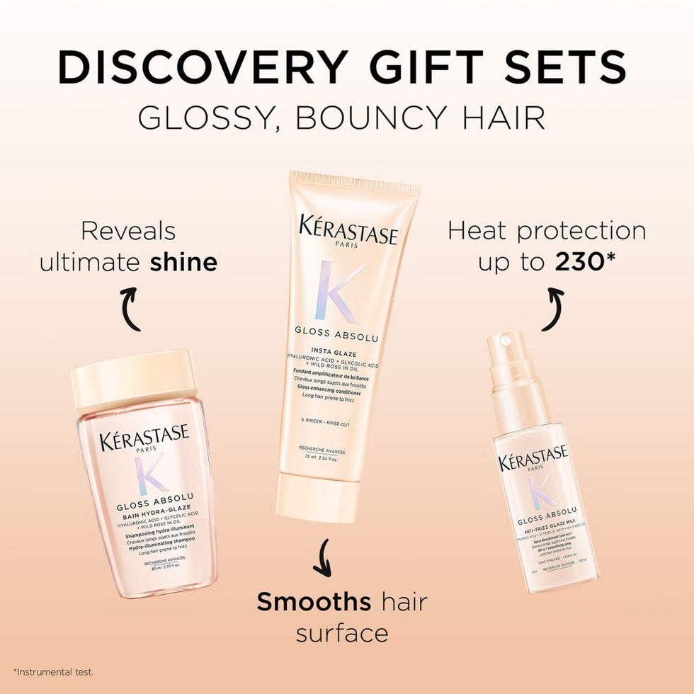 Tame unruly strands and reveal a long-lasting, mirror-like shine with the Kérastase Gloss Absolu Discovery Set. Specially designed for hair prone to frizz, this luxurious trio smooths, nourishes, and enhances manageability while protecting against humidity and external aggressors.