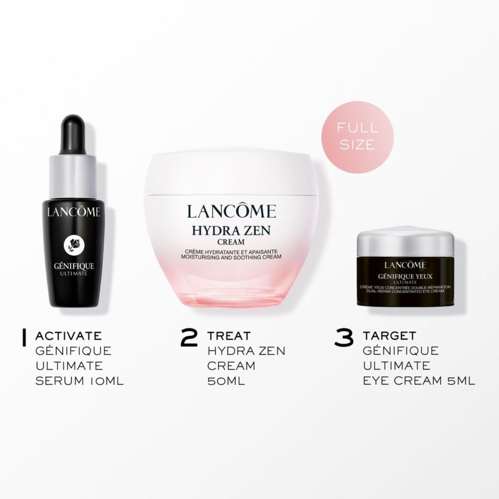 Content - This limited-edition set combines the comforting hydration of Hydra Zen Day Cream (50ml), offering 48 hours of moisture and visible redness reduction, with the strengthening power of Génifique Ultimate Serum (10ml) and the smoothing care of Génifique Ultimate Eye Cream (5ml).
