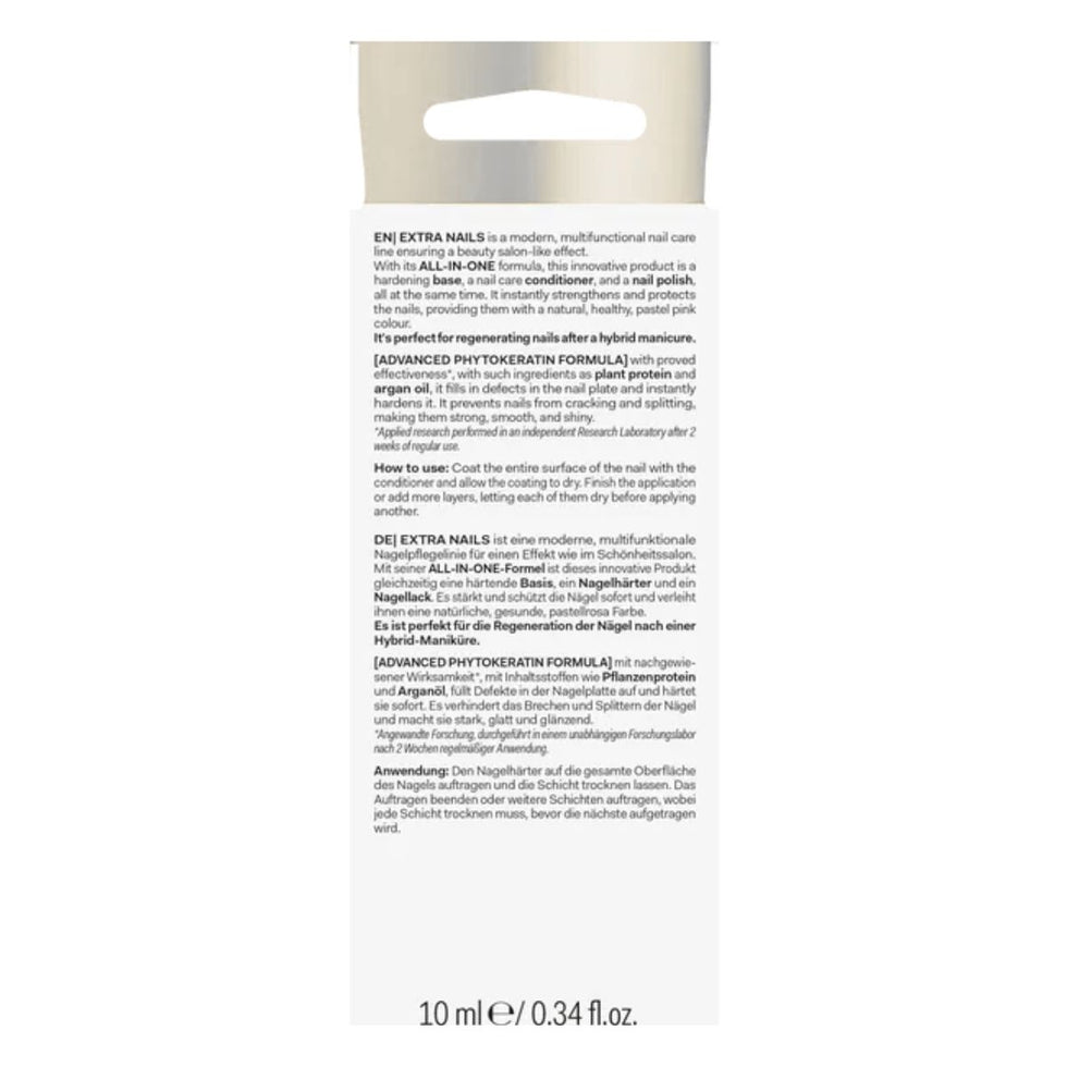 EXTRA NAILS is a modern, multifunctional nail care range designed to deliver a professional, salon-quality finish at home. Thanks to its innovative ALL-IN-ONE formula, this advanced treatment works as a strengthening base coat, nail hardener, and polish in one simple step.