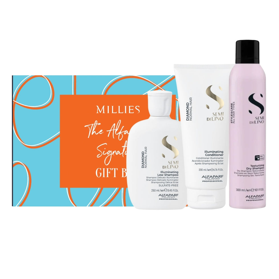 Millies Exclusive The Alfaparf Signature Diamond Gift Box with Free Dry Shampoo is a radiant celebration of shine, softness, and Italian salon luxury. This indulgent haircare set is built around the beloved Alfaparf Semi di Lino Diamond range, known for transforming dull, tired hair into silky, light-reflecting strands full of life and vitality. Packed with nutrient-rich ingredients and shine-boosting technology, each product works in harmony to cleanse, condition, and illuminate your hair - leaving it glossy, weightless, and full of movement.