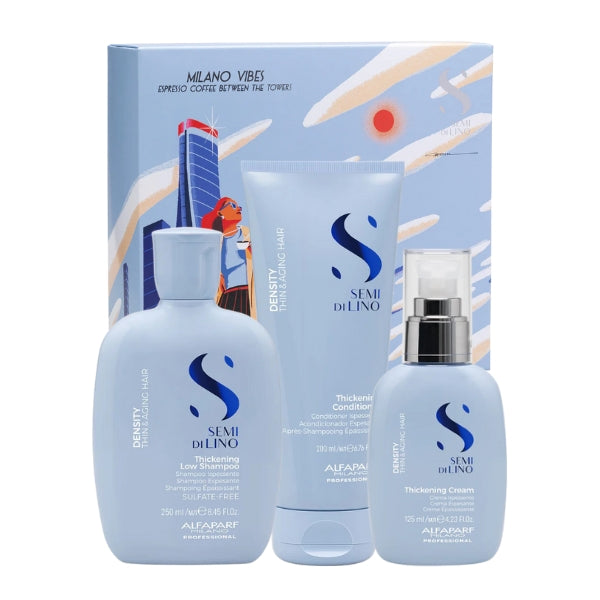 SEMI DI LINO DENSITY - thin and aging hair. Thickening Cream gives body and texture to hair while protecting it from heat. The hair fiber regains thickness and vitality, for a youthful and healthy appearance. Vegan Formula.