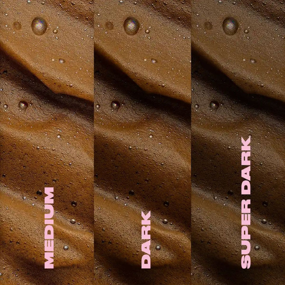 SUPER DARK: Aqua (Water), Dihydroxyacetone, Glycerin, Erythrulose, Ethoxydiglycol, Polysorbate-20, Parfum, Phenoxyethanol, Coco Glucoside, Tocopheryl Acetate, Ethylhexylglycerin, Benzoic Acid, Dehydroacetic Acid, Citric Acid, Aloe Barbadensis Leaf Juice Powder, Saccharide Isomerate, Maltodextrin, Sodium Citrate, Potassium Sorbate, Ascorbic Acid, CI 42090, CI 17200, CI 19140, CI 14700.