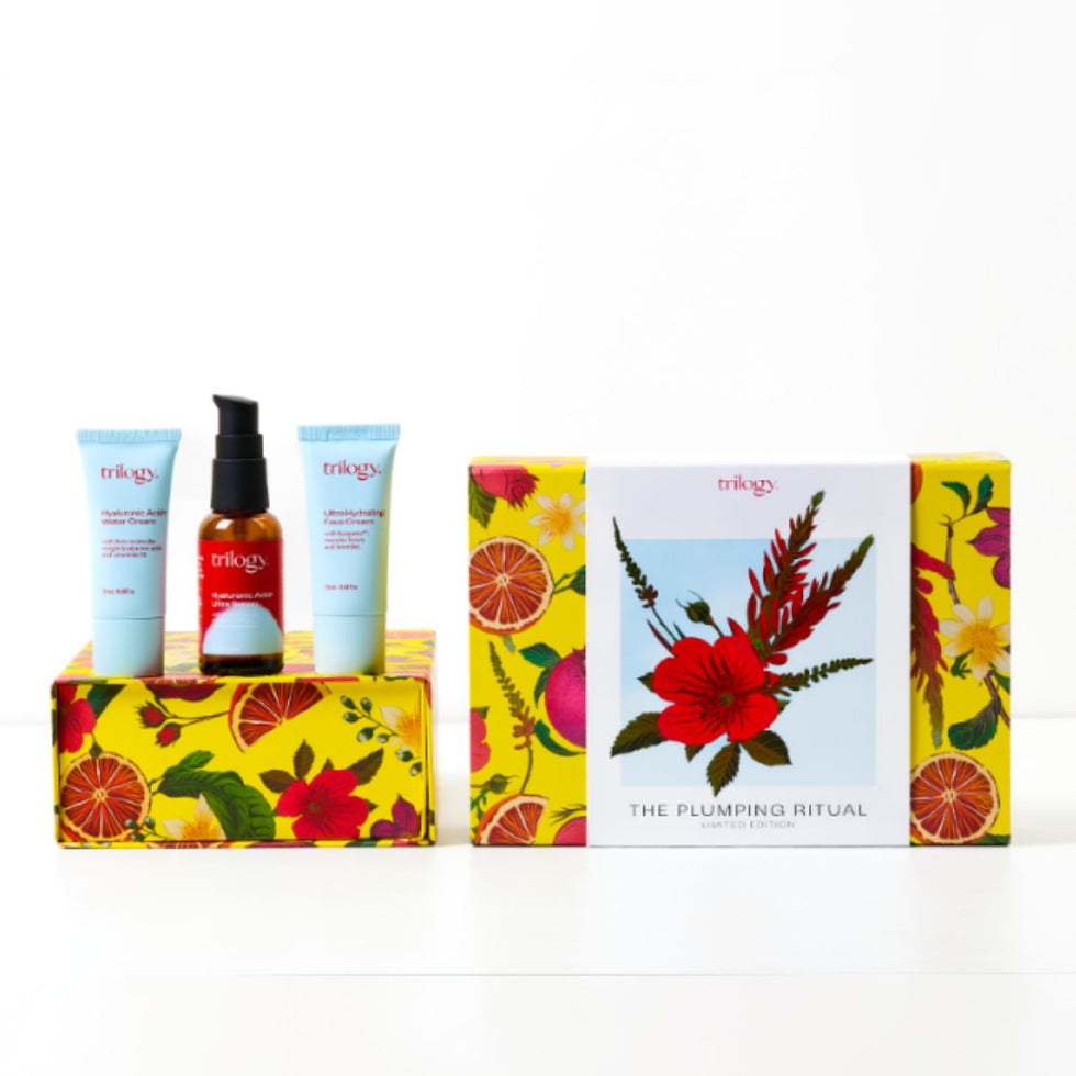 Acid+ Water Cream: Aqua (water), Aloe barbadensis (aloe vera) leaf juice, Shea butter ethyl esters, Caprylic/capric triglyceride, Glycerin, Glyceryl stearate citrate, Sodium hyaluronate, Glyceryl glucoside, Hydrolyzed sodium hyaluronate, Ceramide NP, Sclerotium gum, Cetearyl alcohol, Sodium phytate, Xanthan gum, Algin, Parfum (fragrance), Citric acid, Potassium sorbate, Sodium benzoate, Benzyl alcohol, Dehydroacetic acid. 99% of total ingredients are from natural origin. Acid+ Ultra Serum: Aqua (water), Aloe barbadensis (aloe vera) leaf juice, Pentylene glycol, Sodium hyaluronate, Glyceryl glucoside, Hydrolyzed eragrostis tef seed extract, Chenopodium quinoa (quinca) seed extract, Hydrolyzed sodium hyaluronate, Sclerotium gum, Sodium phytate, Citric acid, Xanthan gum, Algin, Sodium benzoate, Potassium sorbate, Benzyl alcohol, Dehydroacetic acid 99.1% of total ingredients are from natural ongin. Hydrating Face Cream: Aqua (water), Aloe barbadensis (aloe vera) leaf juice, Prunus amygdalus dulcis (sweet almond) oil, Ricinus communis (castor) seed oil, Cetearyl alcohol, Glyceryl stearate SE, Glycerin, Mel (honey), Caprylic/capric triglyceride, Oenothera biennis (evening primrose) oil, Cocos nucifera (coconut) oil, Rosa canina (rosehip) seed oil, Solanum lycopersicum (tomato) seed oil, Vaccinium macrocarpon (cranberry) seed oil, Helianthus annuus (sunflower) seed oil, Lycopene, Euterpe oleracea (acai) fruit oil, Tocopherol (vitamin E), Avena sativa (oat) kernel extract, Persea gratissima (avocado) oil, Tocopheryl acetate (vitamin E), Rosmarinus officinalis (rosemary) leaf extract, Cetearyl wheat straw glycosides, Sodium stearoyl glutamate, Parfum (fragrance), Citric acid, Potassium sorbate, Sodium benzoate, Benzyl alcohol**, Dehydroacetic acid**, citral*, citronellol*, geraniol*, limonene*, linalool* *Components of natural essential oils **Preserved with Dehydroacetic acid and Benzyl alcohol 99.2% of total ingredients are from natural origin.